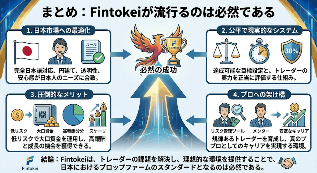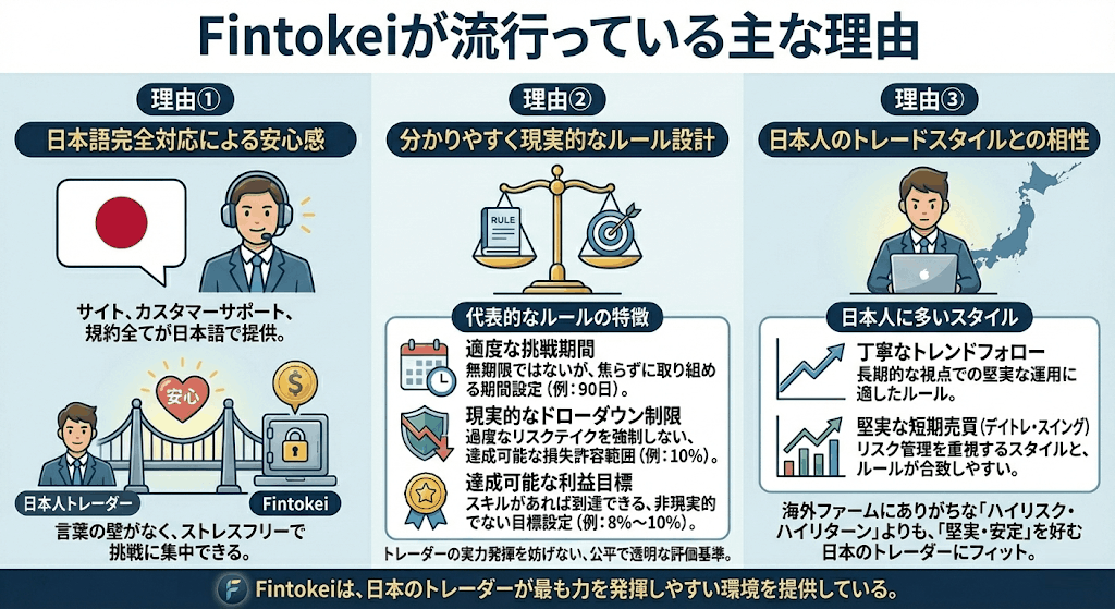 Fintokeiは、この流れの中で「日本人トレーダーが安心して参加できるプロップファーム」として、明確なポジションを築いています。