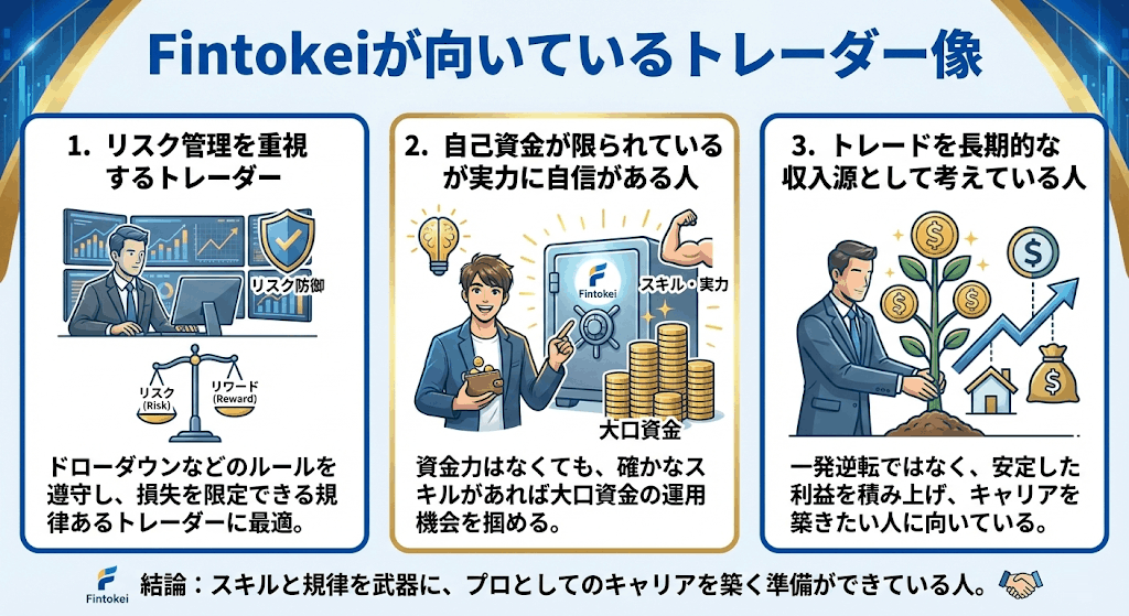 短期的な一攫千金ではなく、継続的な収益を目指す人にとって、Fintokeiはトレードを“職業”に近づける環境を提供します。