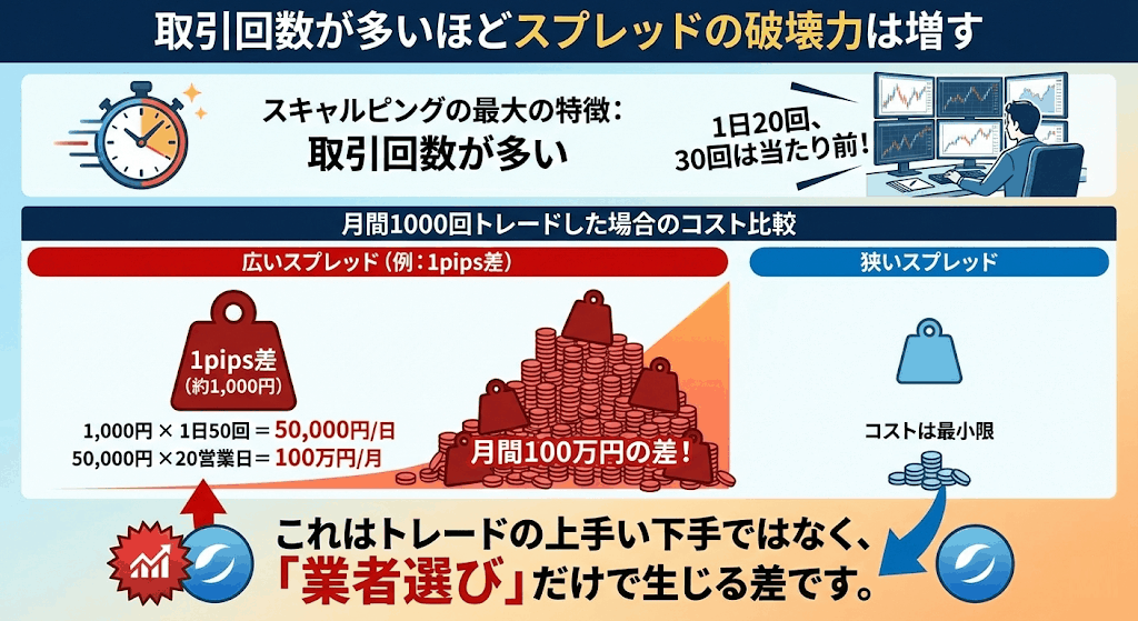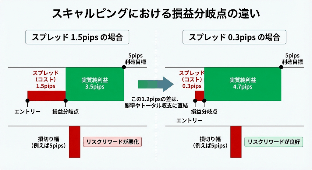 スプレッドは、トレードを始めた瞬間に発生する「確定コスト」であり、スキャルピングではこのコストが利益の大部分を奪ってしまうことがあります。