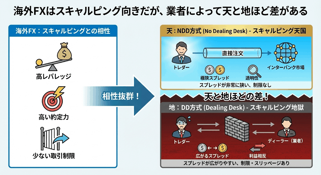 海外FXは高レバレッジ、約定力、取引制限の少なさから、スキャルピングと非常に相性が良い環境です。