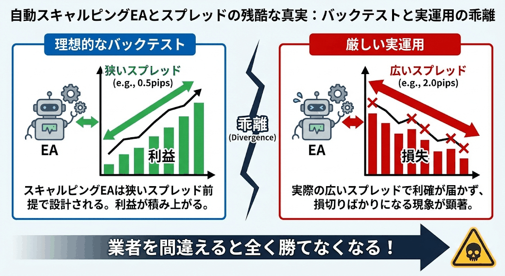 本記事では、具体的な損益シミュレーション、通貨ペア別の影響、自動売買EAとの関係、海外FX業者の取引環境の違いなどを交えながら、なぜスキャルピングではスプレッドが最重要指標になるのかを徹底解説します。