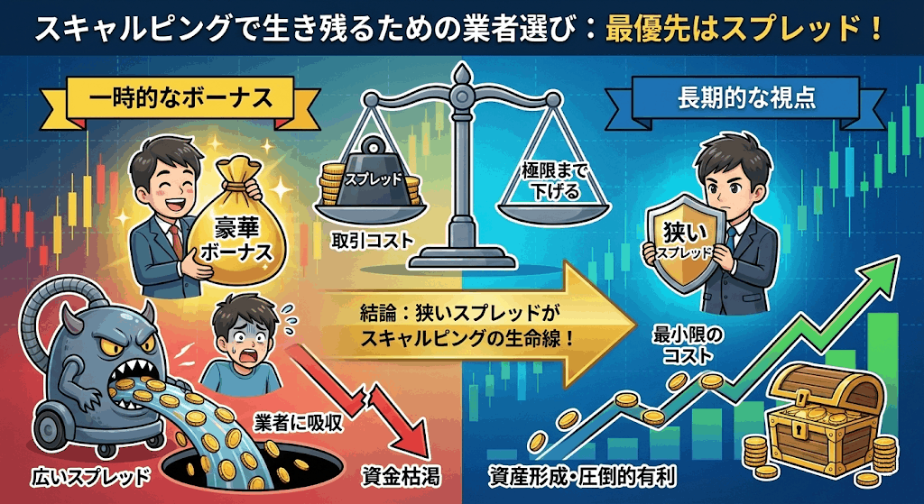 一時的なボーナスで資金が増えても、スプレッドが広ければ、いずれその利益はすべて業者に吸い取られます。